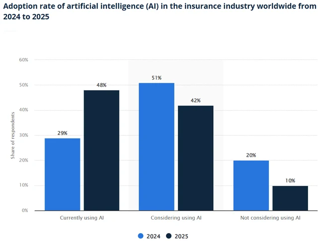 在全球範圍內,48% 的保險公司在2025 年仍在使用人工智慧,這一比例比2024 年的29% 有所增加,這意味著還有巨大的未開發機會。