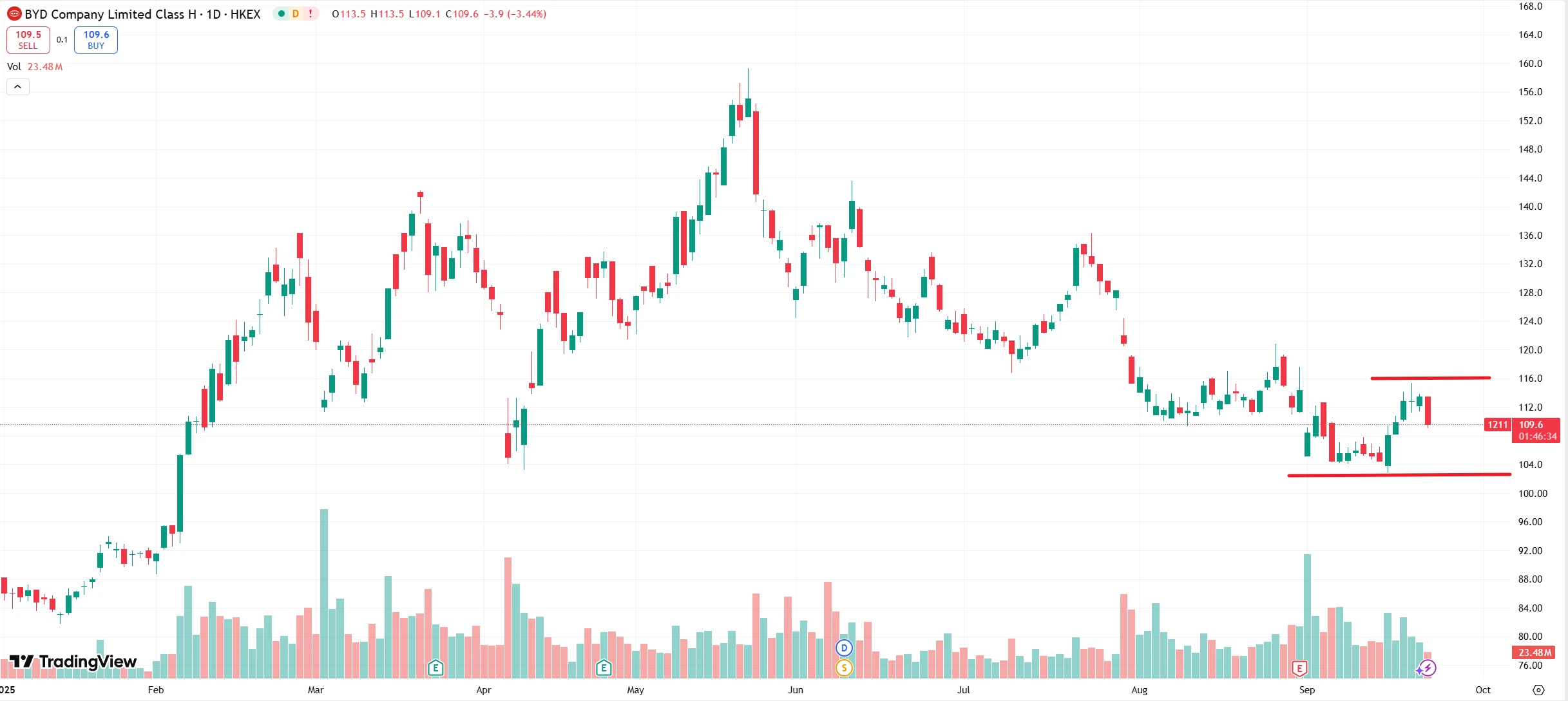 從具體技術走勢來看,比亞迪H股目前處於關鍵價格區間。截至9月22日,股價在110港元附近波動,該位置處於前期壓力位114.01港元與支撐位103.23港元之間。這一區間是市場多空力量的平衡點,突破或跌破將對短期趨勢產生重要影響。值得一提的是,9月22日盤中最低價觸及109. 2港元,接近支撐位,顯示該區域存在一定買盤支撐。