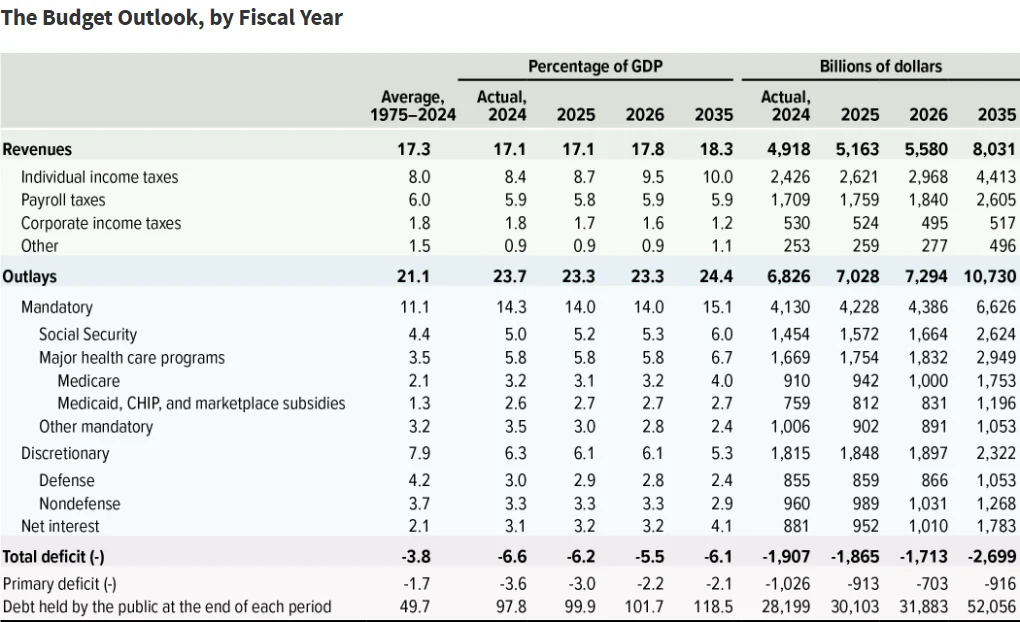 除此之外,全球貨幣體系重構則是金價上漲的深層邏輯。首先,美元信用體係正面臨多個挑戰:美國聯邦政府債務規模已突破36兆美元,自2020年以來,債務增加了13兆美元,連續五年平均每年增加2.6兆美元。美國國會預算辦公室(CBO)預計2025財年美國聯邦預算赤字將達1.865兆美元,佔國內生產毛額(GDP)的6.2%。
