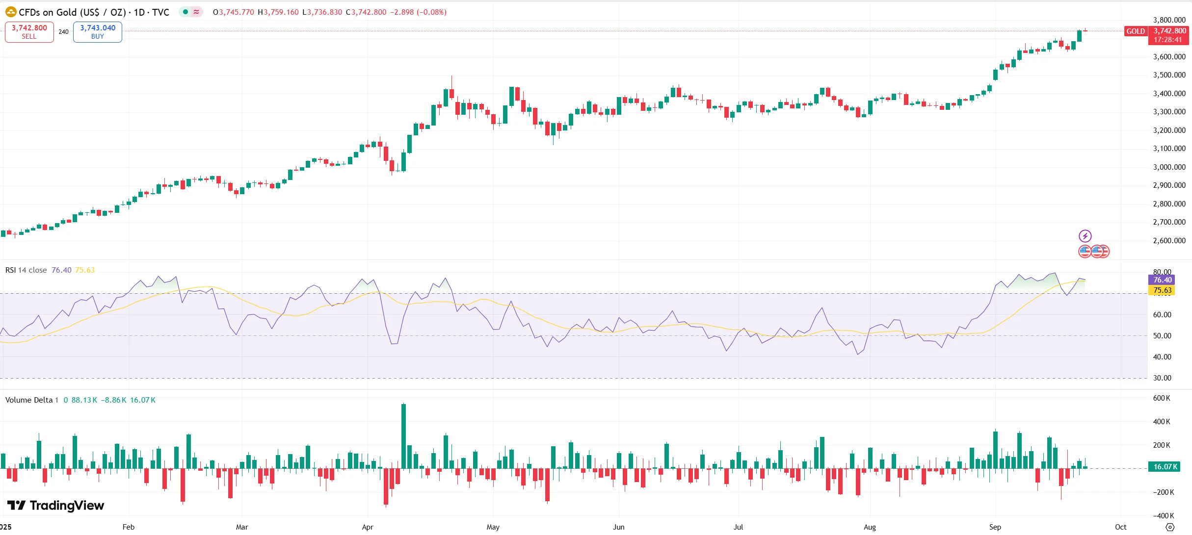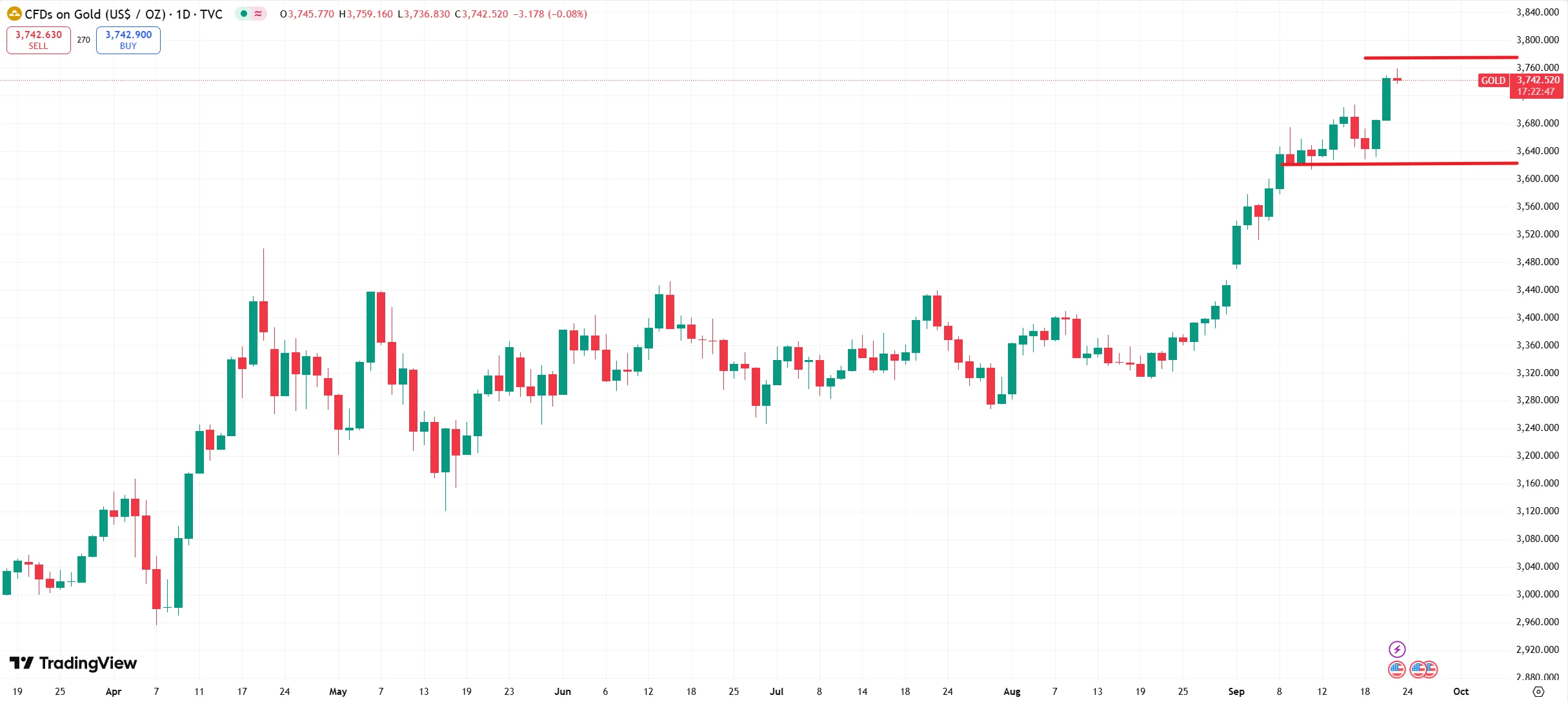 從技術面看,9月以來,金價走勢強勁。繼9月2日突破3,500美元/盎司、9月6日站上3,600美元/盎司後,僅用9天時間便完成3,700美元/盎司關口的跨越。在突破3,600美元關鍵阻力位後,觸發了程序化交易買盤。在突破後的短期內,價格呈現明顯上漲態勢,結合9月6日至9月19日倫敦金現貨價格從約3,600美元漲至3,684.65美元來看,漲幅約2.35%。