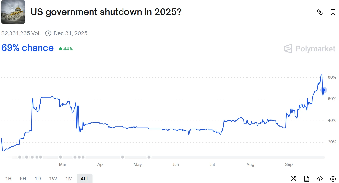 如果美國國會沒有採取行動,政府或將在10月1日停擺,就業報告也將不會準時公佈。目前,市場認為這次美國政府關門可能性接近70%。