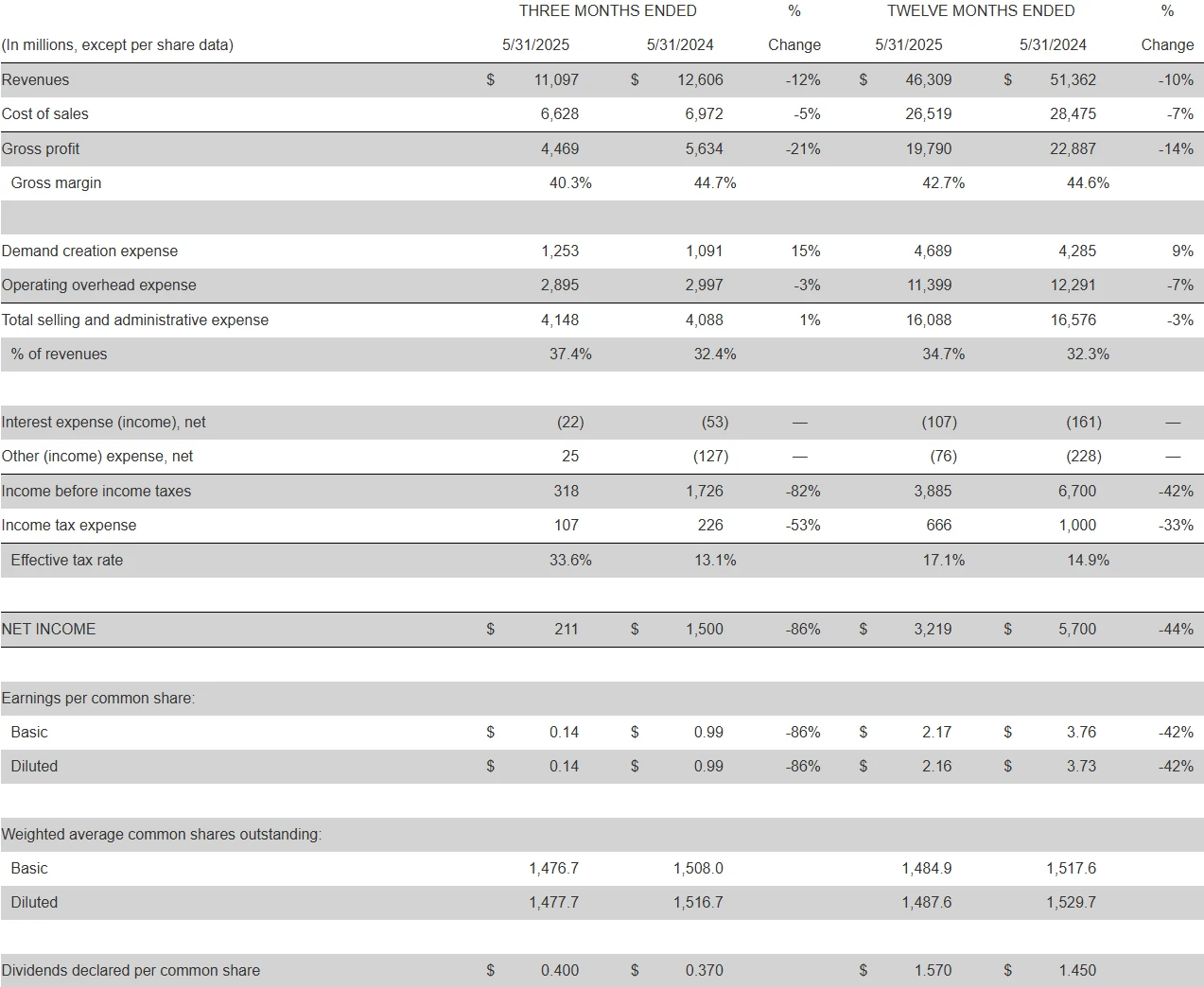 2025 財年全年營收463.09 億美元,上年為513.62 億美元,年減10%;淨利32.19 億美元,上年為57 億美元,年減44%。其中,大中華區財年總營收65.86 億美元,年減13%。