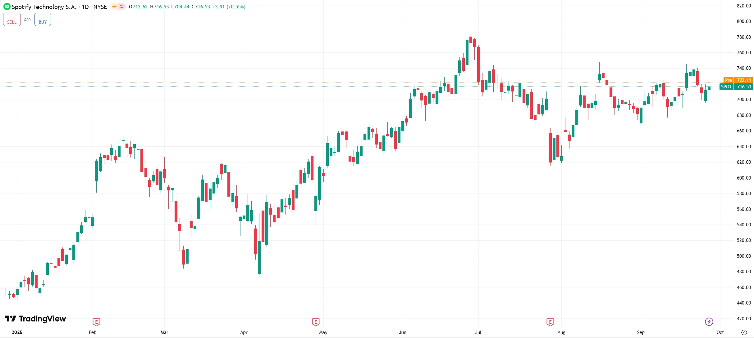截至2025年9月,Spotify股價呈現「全年強勢、短期放緩」的分化特徵-年內累計漲幅達60.16%,顯示出強勁的上漲動力。不過,這種強勁勢頭在近期有所收斂,2025年第三季(7-9月)該股單季回報率僅0.4%,股價長期在700-750美元區間震盪,短期動量顯著減弱,引發部分投資者對「行情是否見頂」的討論。