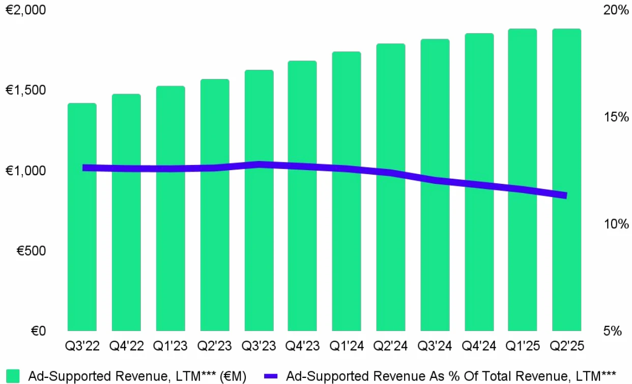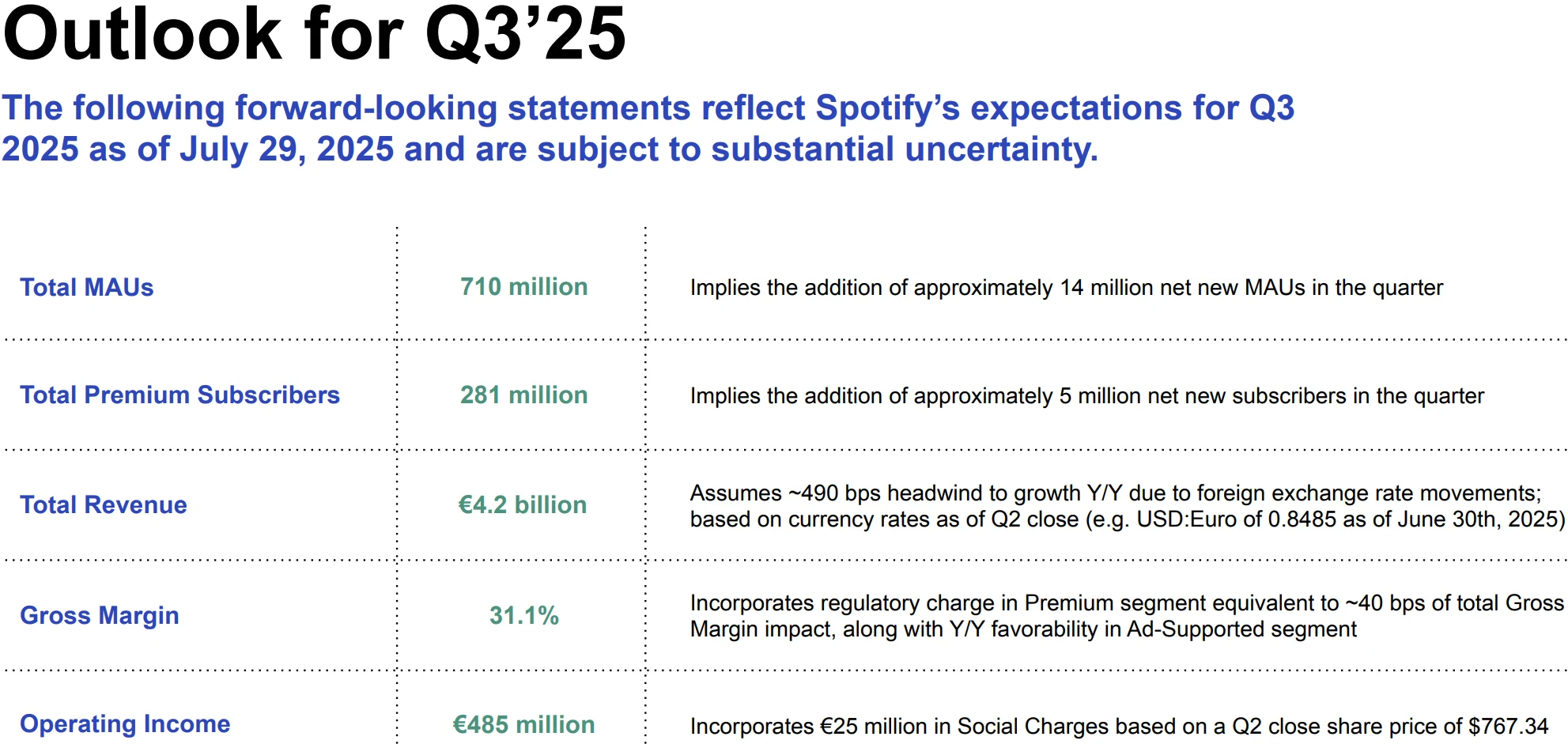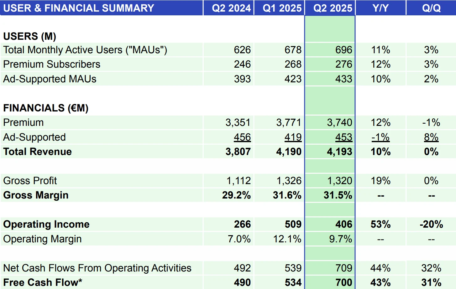 對Spotify來說,目前橫盤期的基本面支撐並未弱化:2025年Q2財報顯示,公司月活躍用戶(MAU)達6.96億,較去年同期成長11%;付費訂閱用戶2.76億,年成長12%,用戶規模成長仍高於全球串流媒體產業8%的平均水準;核心獲利指標更具韌性-剔除可交換票據估值變動的非經常性影響後,營運現金流較去年同期翻倍至12億美元,毛利率提升227個基點至31.5%,業務實質的獲利能力仍在強化。