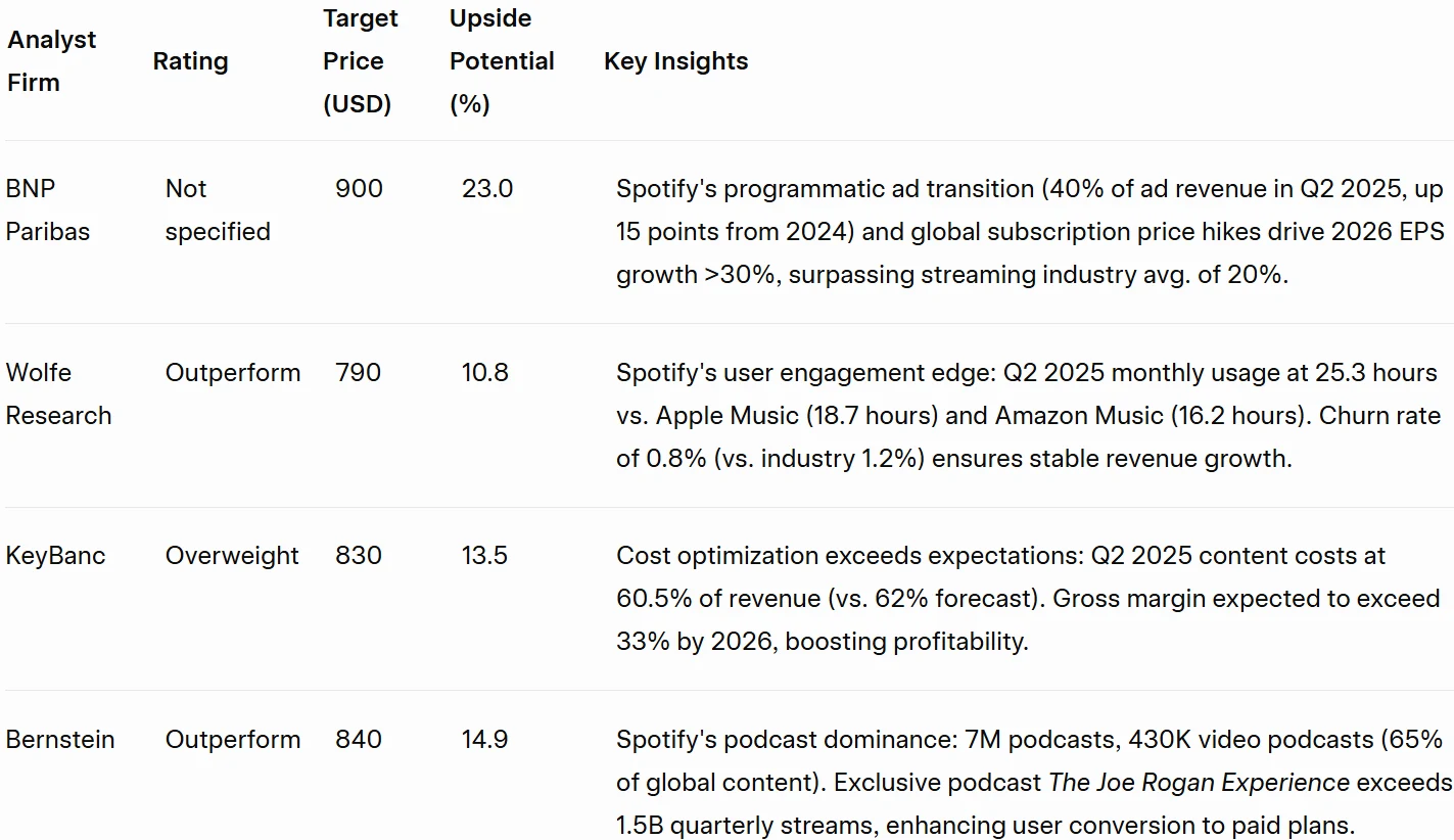 截至2025年9月,涵蓋Spotify的26位分析師中,有84.61%給予買入評級, 15.39%給予持有評級,並無賣出評級,分析師群體對其中長期增長前景形成共識,且頭部機構的目標價均指向明確的上行空間: