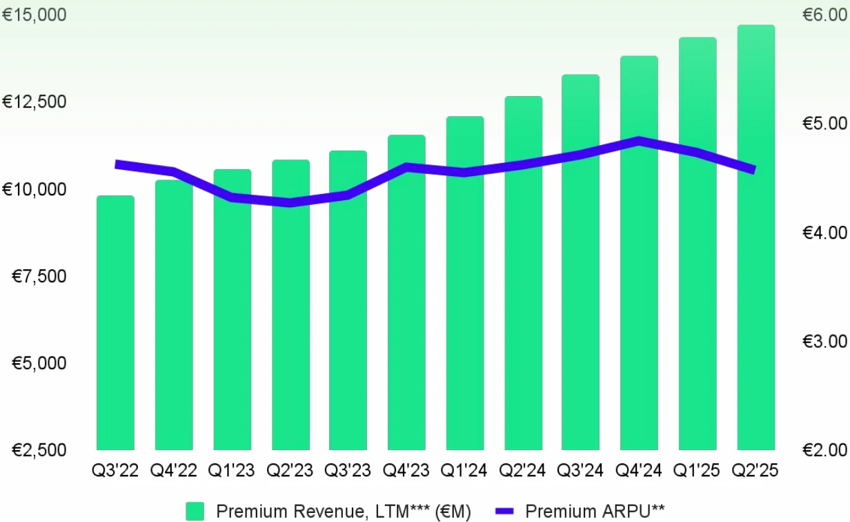 值得注意的是,Spotify當前橫盤期還疊加了“尚未完全兌現的利好預期”,這進一步提升了後續突破的可能性。2025年9月啟動的全球訂閱漲價(涵蓋歐洲、亞太等主要市場,個人計畫提價9%-12%),預計將在Q4開始逐步反映到營收端,測算顯示此舉可推動每付費用戶平均收入(ARPU)提升2.3%-2.8%,對應年增收1.7億-2億歐元。