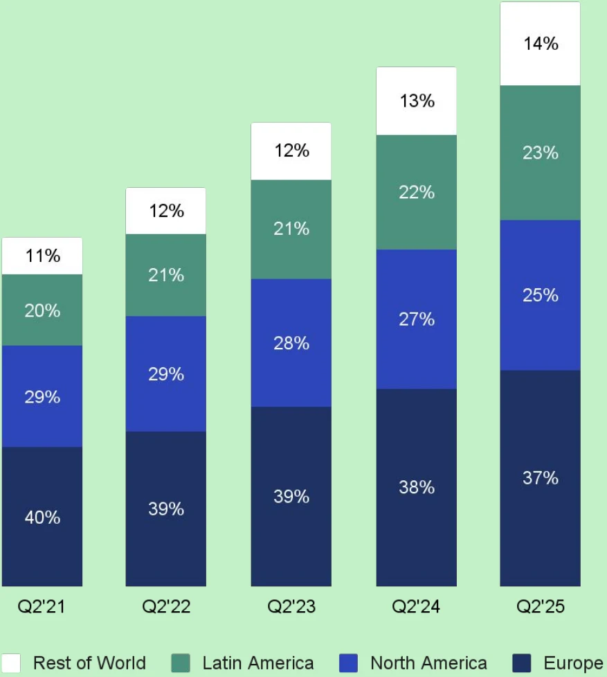 從競爭格局來看,Spotify在全球串流音樂和播客市場處於領先地位。截至2025年第二季度,Spotify活躍用戶數達到6.96億,其中訂閱用戶2.76億,廣告支援用戶4.33億,佔全球音樂串流訂閱市場約32%的份額,在除中國市場外的全球市場,其市場份額穩定在40%左右。