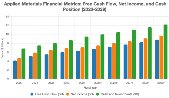 應用材料強勁的資產負債表得益於強勁的現金流。過去五個財年,應用材料年均自由現金流為56億美元,隨著業務規模的成長,我們預計這一數字將超過我們五年的預測,達到80億美元以上。這兩項收入均接近應用材料淨收入的90%。