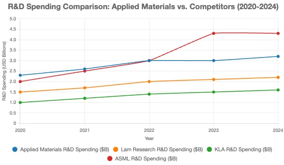 沉積約佔整個WFE市場的四分之一,應用材料公司40%以上的市佔率是其最接近競爭對手的兩倍以上。在蝕刻和製程控制領域,應用材料公司分別佔據第三和第二位,並且是唯一在這三個市場中市佔率均超過10%的公司。應用材料公司在WFE的一些較小細分領域也佔據主導地位,例如熱處理和摻雜(將雜質有意引入本徵半導體,以調節其電學、光學和結構特性)。對我們來說,這些強大的市佔率源自於無與倫比的產品組合廣度和深度,以及市場領先的30億美元年度研發預算。這項預算遠超過WFE所有競爭對手,除了規模最大的競爭對手之外,這也使應用材料公司能夠繼續建立其龐大的無形資產基礎。其強大的產品組合輔助公司實現了45%左右的健康非公認會計準則毛利率。