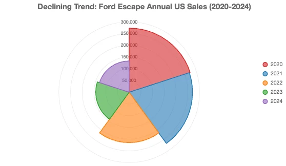 然而,正如您在下圖中所看到的,儘管截至7 月份,Escape 的銷量超過了熱門車型,但實際上,在過去五年中,Escape 的銷量卻是有史以來最糟糕的。