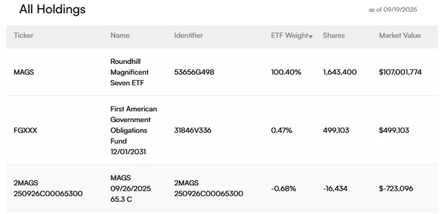 關於該基金,需要注意的是,MAGY 實際上並沒有持有美股七巨頭的普通股。相反,MAGY 幾乎只持有Roundhill 自己的ETF——Roundhill Magnificent Seven ETF。查看下方持股明細,我們可以看到MAGY 僅持有MAGS 和First American Government Obligations,後者只是一隻持有貨幣市場證券的基金。