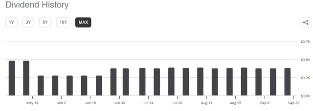 截至最新每週派息金額為每股0.379943 美元,預計年派息率約為34.67%。 MAGY 在過去幾個月中一直保持派息相對穩定。鑑於過去幾個月市場一直處於上漲趨勢,這種一致性更容易實現。市場動能的轉變始終有可能導致派息下降,但到目前為止管理層在維持派息穩定方面做得很好。