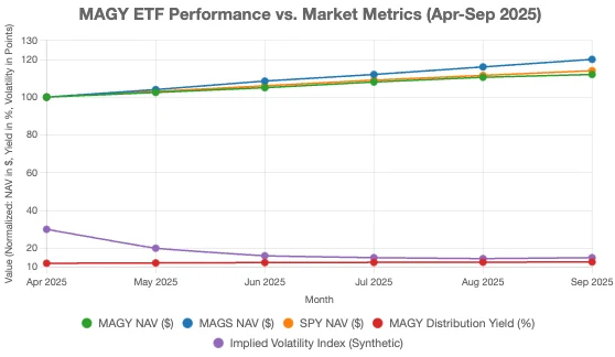 我先來簡單介紹一下基本情況。這隻ETF非常新,成立於2025年4月22日。其標的資產MAGS比MAGY早兩年多,因此基金經理人擁有豐富的歷史數據可供參考。即便如此,請記住,MAGY只顯示大約五個月的表現數據。諷刺的是,這應該能讓我們更了解市場狀況,因為它消除了造成4月市場低谷的大部分噪音。