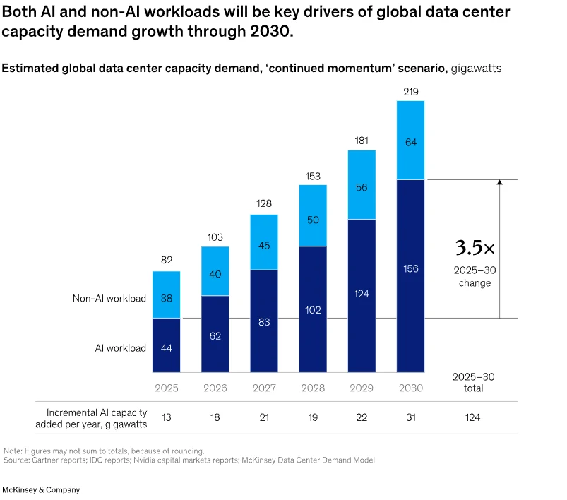 10GW的資料中心規模在業界堪稱標竿-麥肯錫資料顯示,2025年全球AI工作負載的電力需求僅為44GW,此專案將佔全球近四分之一的AI算力資源。從成本結構來看,建造1GW資料中心需投入500-600億美元,其中350億美元用於英偉達晶片和系統,這意味著整個專案將為英偉達帶來約3,500億美元的直接收入。
