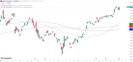 不只標普500,那斯達克指數已於本週一完成黃金交叉。英偉達、微軟、Meta等核心科技股維持技術強勢,其中英偉達股價在6月底完成自身的金叉結構。此外,Russell 2000指數在近期強勁反彈後也正逼近關鍵技術位,反映出市場參與度的廣泛提升。