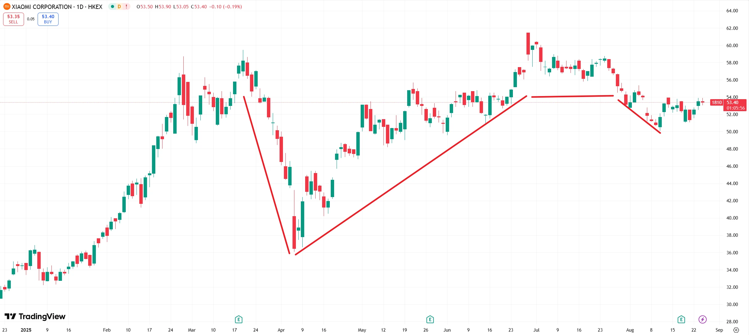 自2025年以來,小米股價呈現明顯波動特徵,年初至今雖上漲54%,但經歷了多次大幅調整,反映出市場對其生態模式認知不斷修正。3月19日股價觸及年內高點59.45港元後,4月11個交易日內回檔逾33%,最低至36.45港元。進入8月,股價再次承壓,8月7日盤中跌超5%,財報發布日高開未能延續上漲,最終收跌1.23%,截至發稿,股價報53.6港元,總市值1.39兆港元。