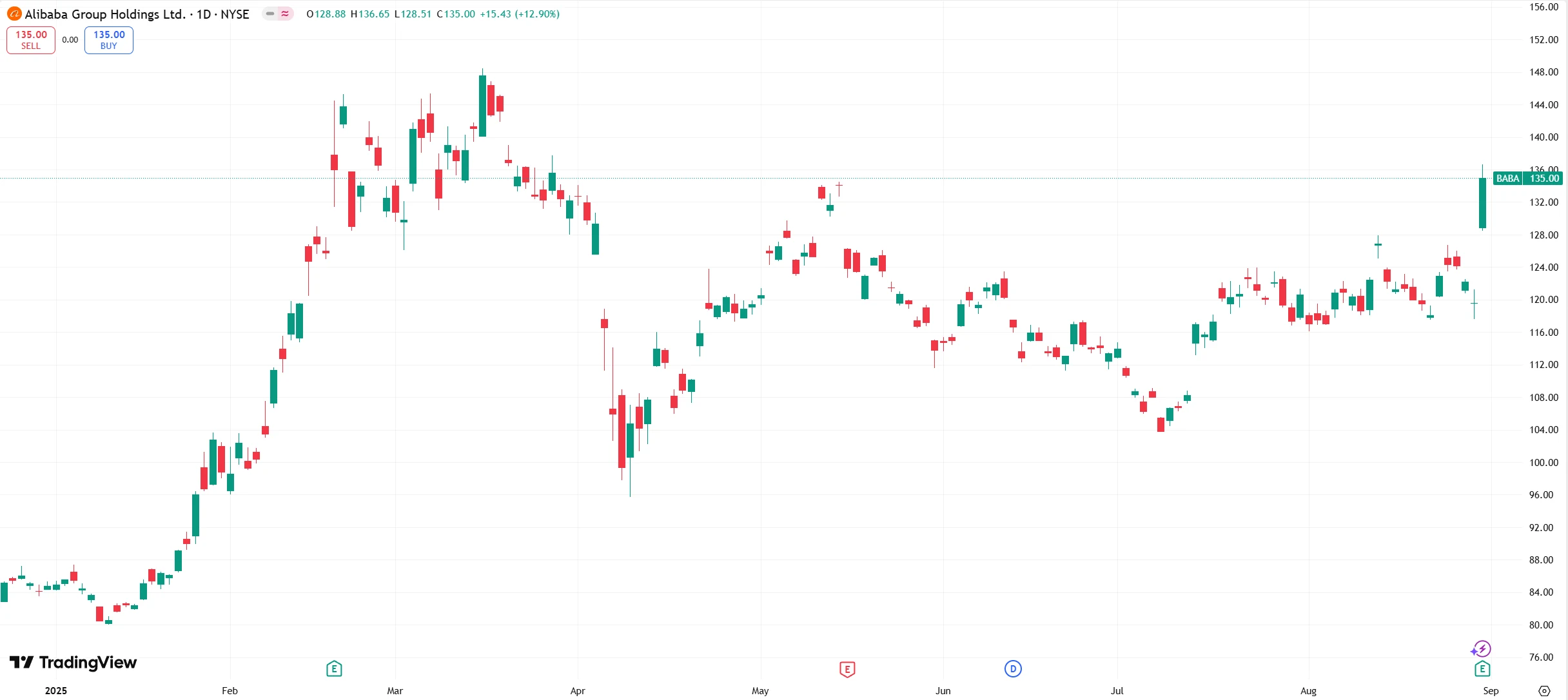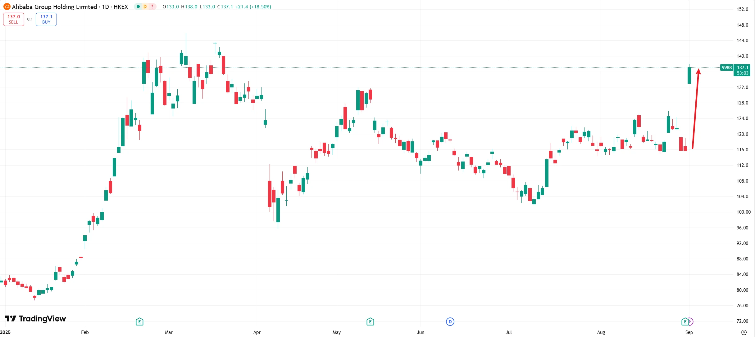 財報發布後,8月29日美股開盤後阿里巴巴股價直線拉升,最終收漲12.9%,報135美元,總市值達3,219億美元。 9月1日港股市場延續漲勢,開盤高開近15%,盤中漲幅一度超過18%,創今年3月以來新高。