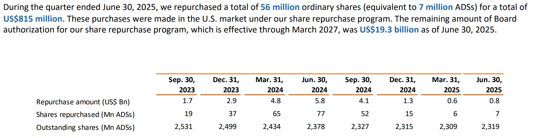 從資本結構來看,阿里巴巴依然保持著強勁的財務韌性。截至2026年6月30日,公司現金及其他流動投資達5,856.63億元(817.55億美元),為持續的策略投入提供了基礎。同時,公司在本季回購了5,600萬股普通股,總價8.15億美元,截至季末仍剩餘193億美元回購額度,有效期至2027年3月,這項持續回購計畫向市場傳遞了管理層對公司價值的信心。