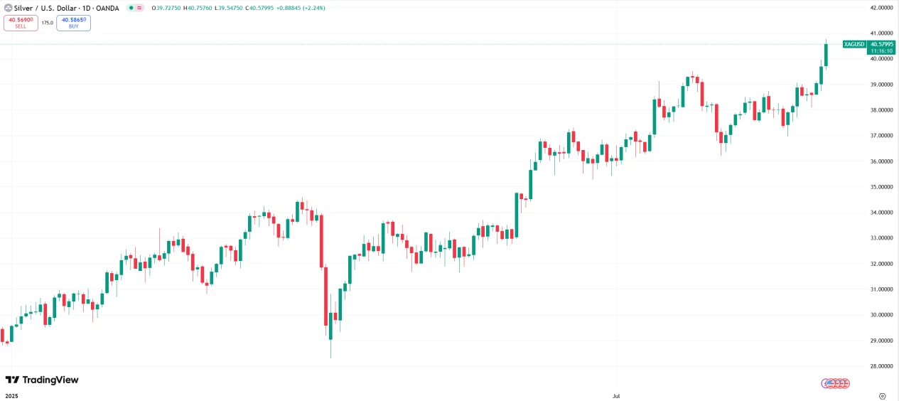 2025年9月1日,國際現貨白銀市場迎來歷史性時刻——倫敦銀現價格突破並站穩40美元/盎司整數關口,最高觸及40.72美元/盎司,創下2011年9月21日以來的新高。截至發稿,倫敦銀現報40.58美元/盎司,較前一交易日上漲0.86美元,漲幅達2.15%。