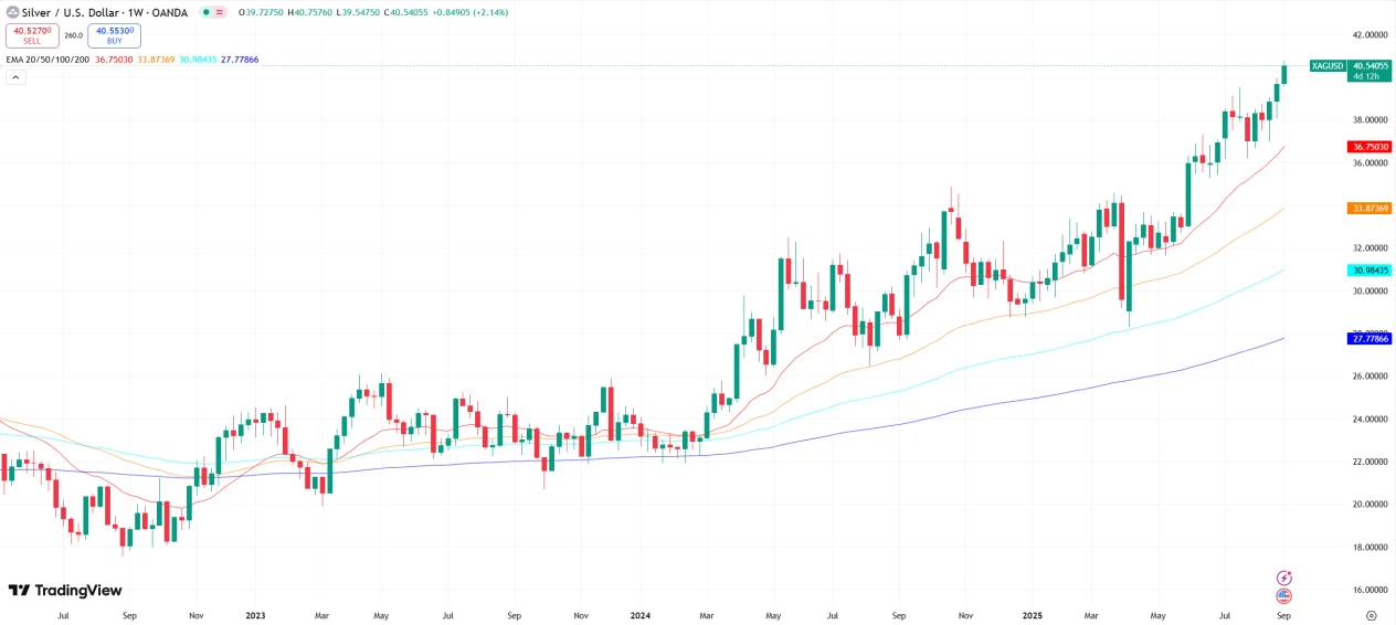 2025年9月1日,現貨白銀價格突破並穩站40美元/盎司整數關口,刷新2011年9月21日以來的新高。這一里程碑標誌著白銀市場進入新階段,歷史上,白銀價格在2011年4月28日曾達到49.82美元/盎司的峰值,當時年平均價格為35.13美元/盎司,而2024年平均價格已升至約28.70美元/盎司,顯示出長期上漲趨勢。